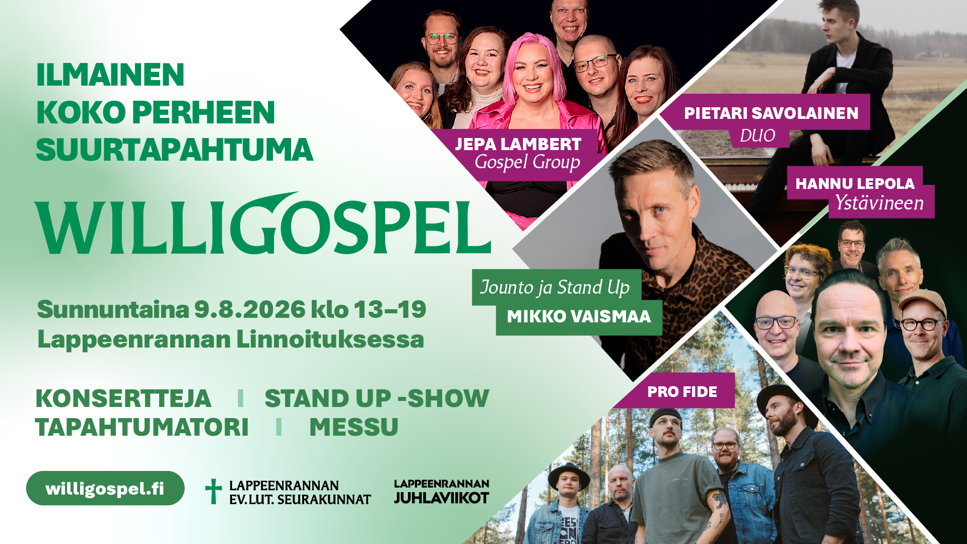 Lappeenrannan Linnoituksen juhlateltan lavalla on esiintymässä kotimaisen gospelmusiikin eturivin artisteja ja tapahtumatorilla on tarjolla monipuolista puuhaa ja koettavaa kaikenikäisille.